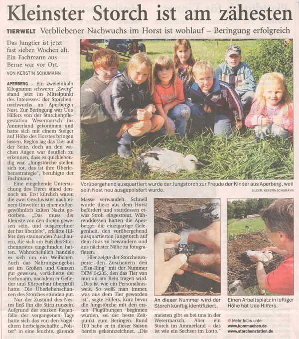 Quelle: NORDWEST- ZEITUNG Regional: Aperberg Titel: Kleinster Storch ist am zähesten vom: 24.07.2007 Autor: Kerstin Schumann
